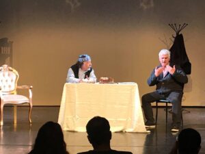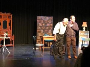 کارگردان نمایش با تلاش فراوان دکوری از وسایل همانجا و دیگر نمایش تهیه کرده بود تا به اتاق یک نویسنده شکل مقبولی ببخشد. این هم از عجایب تاتر «بیچیز و آواره»ی تبعید است.