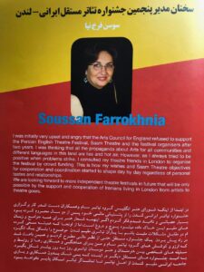 با اندکی تاخیر برنامه افتتاحیه آغاز شد. مجری برنامه ابتدا از تاترورزانی یاد کرد که زندگی را ترک کرده بودند. که البته معلوم نشد که این لیست مجموع در گذشتگان تاتری را در برمیگیرد، چرا لیست چنین کوتاه است و اگر لیست تنها به سال گذشته مربوط میشود چرا برخی میبایستی از لیست حذف شوند یا به اشتباه در لیست ذکر شوند. اما هر چه بود در این شب پنج تن از درگذشتگان مورد توجه جشنواره تاتر لندن قرار گرفتند. پس از این یادکرد که تنها به چند عکس، اسلاید، قناعت شده بود، خانم مجری مدیر فستیوال، خانم سوسن فرخنیا، را به روی صحنه دعوت کرد.